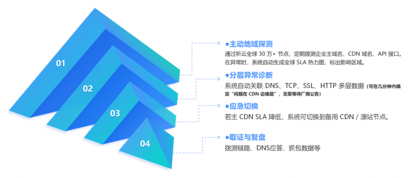 听云 Network 通过主动地域探测、分层异常诊断、应急切换和取证与复盘,构建了从“发现”到“行动”的四步闭环,帮助客户建立独立的观测韧性。