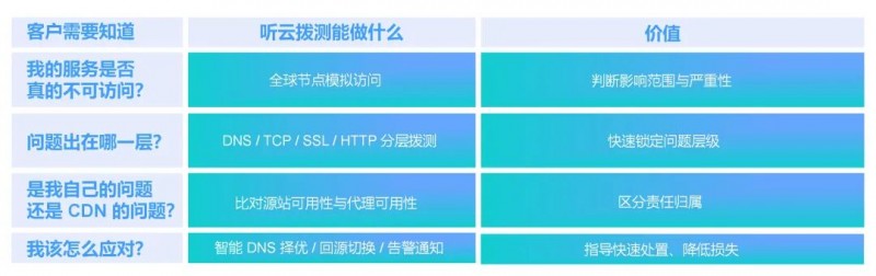 拨测不是替厂商“抓错”,而是替客户“还原事实”,当 CDN 或云服务宕机时,听云 Network 的拨测体系可以帮企业在几分钟内回答这四个关键问题: