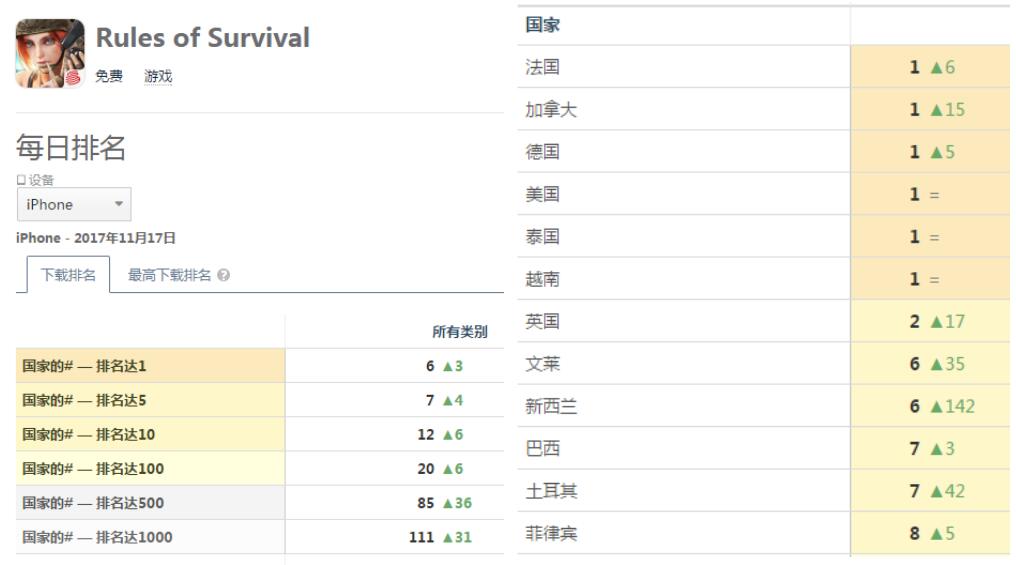目前网易在海外表现最好的一款吃鸡手游,名为《Rules of Survival》(中文直译:生存法则),今日在美国iOS免费榜保持第1,这个成绩实在惊人!这款吃鸡手游同时在加拿大、法国、德国、泰国、越南也成功在appstore免费榜登顶。