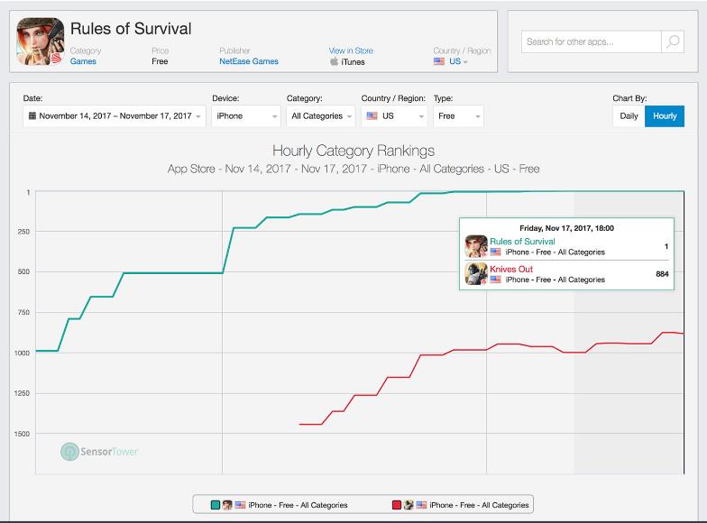 根据美国数据公司SensorTower今日提供给gamelook的数据报告,网易其实还有一款吃鸡手游以英文名《Knives Out》为名也在海外进行了发布、但目前来看《Rules of Survival》保持领先,gamelook认为,这一方面与《Rules of Survival》(生存法则)这个英文名易懂、朗朗上口有关,另一方面或许与网易在《Rules of Survival》上投入了一定全球推广费用有关。