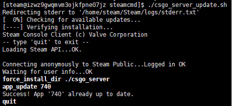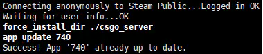 在看到如下图片中最后的行的Success!后,表明CS:GO服务端安装成功(此处使用了更新成功的图片,但同样是Success!字样)