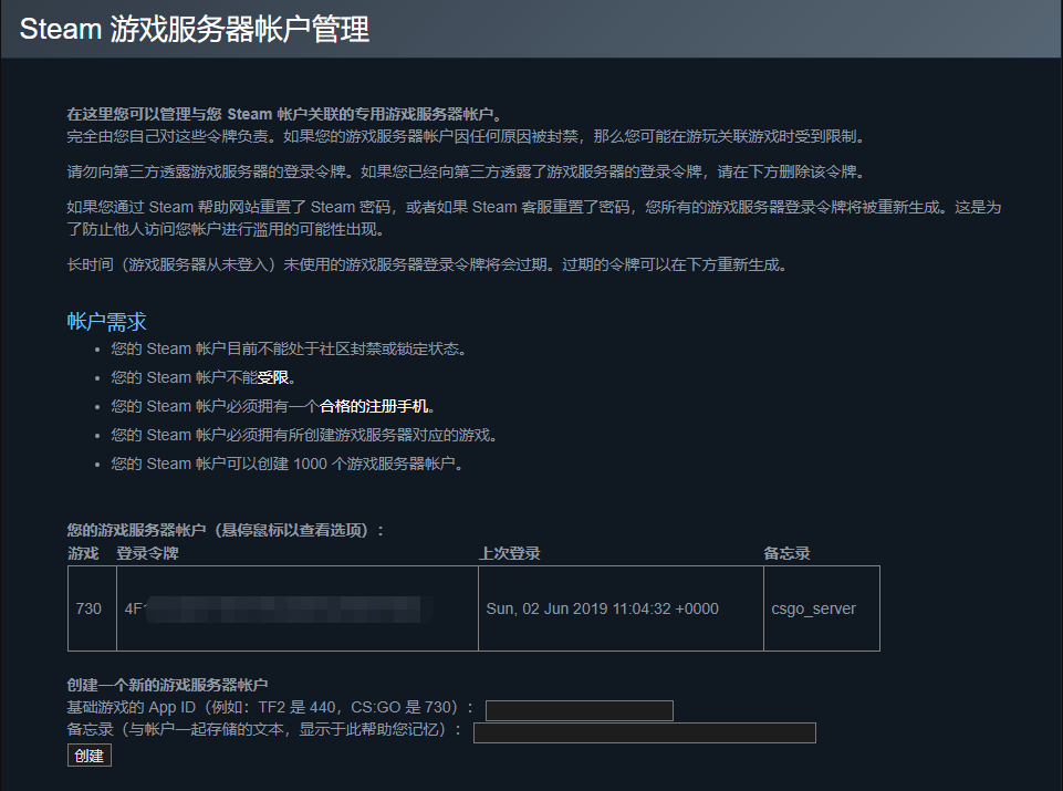 点击创建之后便获得了登录令牌,不要将该令牌泄露出去,该令牌用于服务器在CS:GO社区服务器中验证
