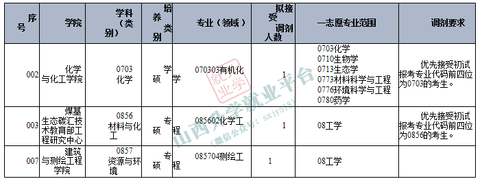 山西大同大学2026年硕士研究生招生调剂公告 (资源与环境、材料与化工第三批次,化学第四批次)根据国家下达的最终招生计划及各学科前期拟录取情况,我校资源与环境、材料与化工专业学位类别将开展第三批次调剂,化学学科开展第四批次调剂。现面向全国公开征集调剂志愿,欢迎符合条件的普通计划及退役大学生士兵计划考生报名。其他专业另行通知。