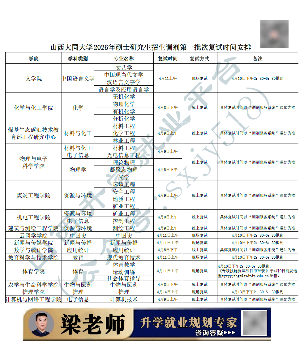 1.复试时间:4月8日教育部调剂系统开通后分批次进行。具体时间以山西大同大学研究生院网站及调剂系统复试通知短信为准。
