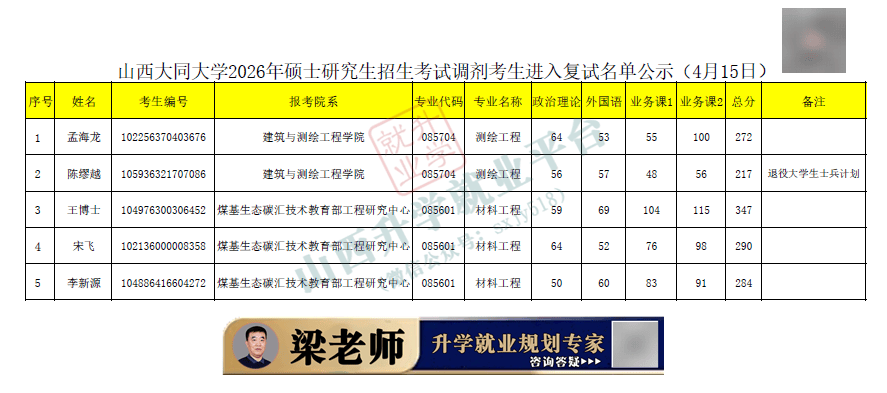山西大同大学2026年硕士研究生招生享受加分政策考生及“退役大学生士兵计划”考生复试名单公示